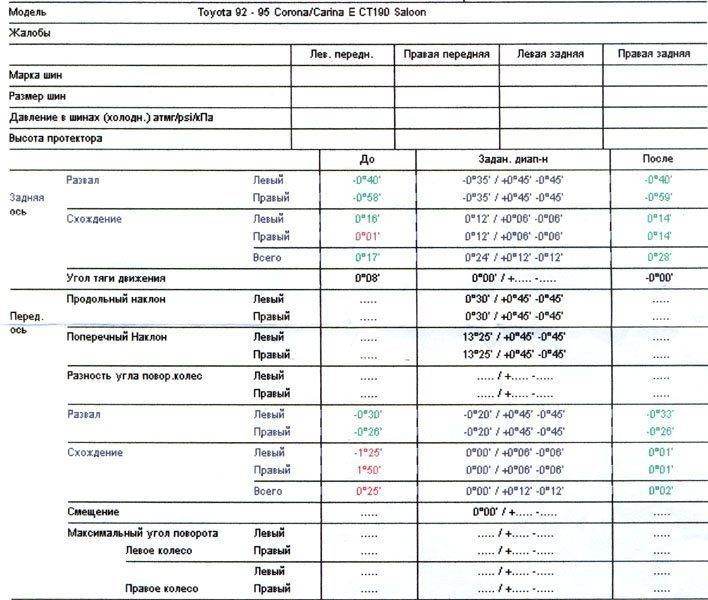 maddmr, у тебя кстати написано там что только для моделей с 96г. Я не спорю с тобой, а именно основываясь на житейском опыте, и дядя это тоже подтвердил, говорю, что никогда его не делал и никаких предпосылок нет. К тому же я обращался на четыре разные СТО нашего города и нигде мне не предлагали сделать развал. Последние два раза делал на одной и той же станции и имею привычку хранить последние показатели (на фото).