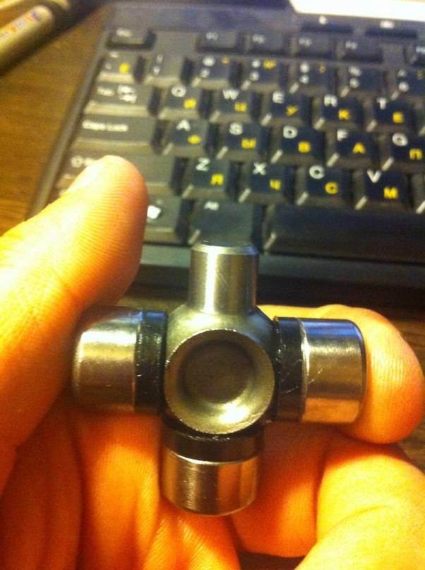 Сегодня перебирал опять свой многострадальный кардан! Снял все быстро, уже опыт есть. И как я и говорил один подшипник крестовины вышел из посадочного места на 2-2,5 мм. из-за этого появился стук в руле. Стал разбирать аккуратно, разобрал, один подшипник уронил блин - пришлось промывать, смазал все подшипники литолом. Вобщем крестовина как новая все крутится гладко. Думал, что при запресовывании первый раз я ее немного покоцал и что не получится снять нормально. Для этого специально купил (перестраховался) жиговскую крестовину за 130р. думал ее сначала ставить. Но после опробования как она вращается - отказался. Вобщем крутилась она очень не плавно. Причиной тому очень плохое качество поверхности шеек крестовины (большая шероховатость) похоже, что не шлифованная, может быть и без термообработки. ВОБЩЕМ ГАЛИМЫЙ КИТАЙ (фотки ниже) - мою ошибку не повторять  . Вот GMB совсем другое дело Собрал все это дело в тисках аккуратно, закернил вроде более мененее нормально. Работу выполнял с помощником (вдвоем намного проще). И самая главная фишка: ЗАМАЗАЛ ЧАШКИ КРЕСТОВИНЫ холодной сваркой (Poxipol два тюбика смешивал). Карданчик спрятал в пыльник и поставил. Надеюсь, что хоть до следующего лета доходит, а там уж оригинал поставлю