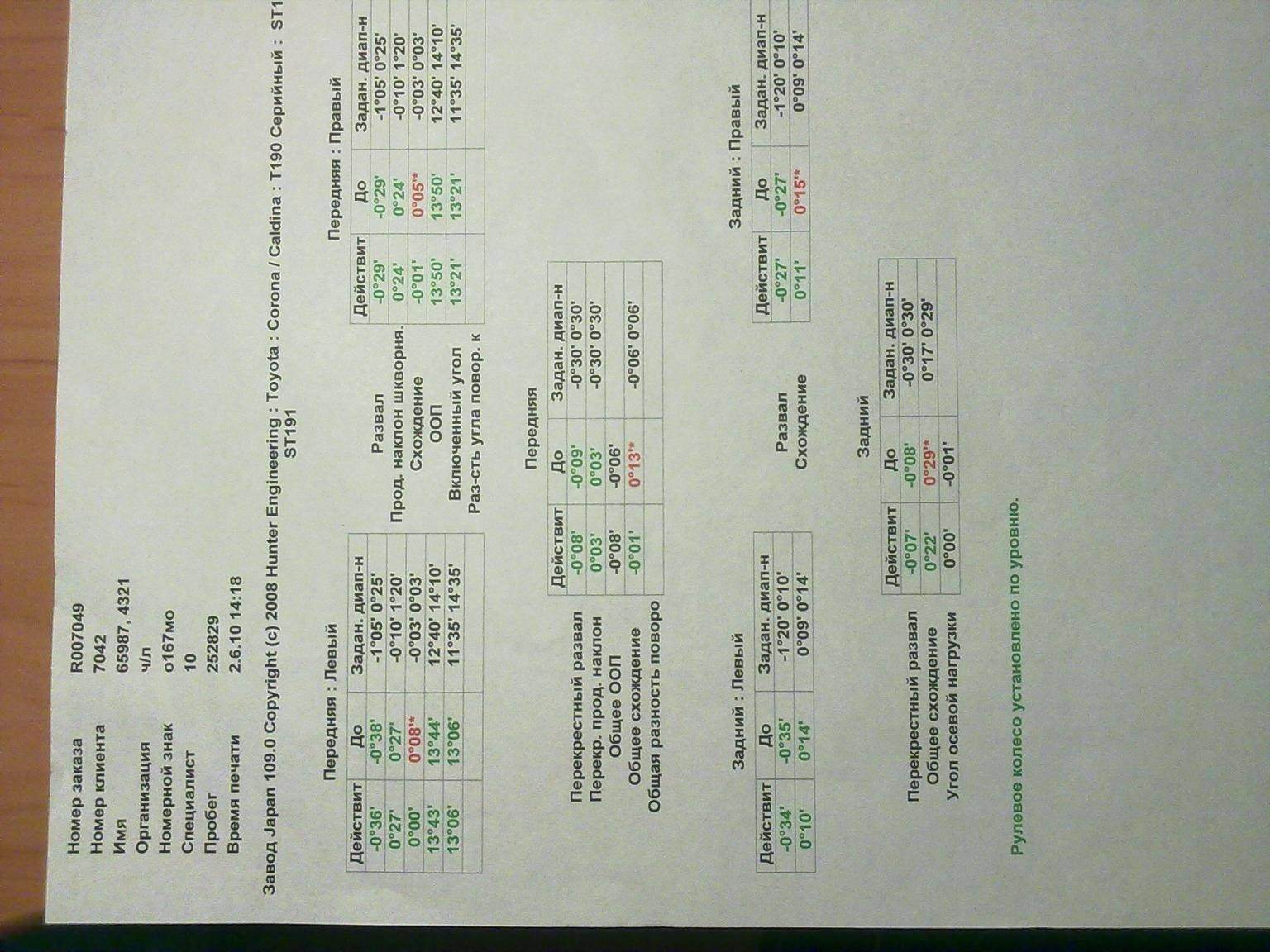 С 6й страницы начинается описание измерений и регулировок передней оси. Подразумевается начилие регулировочных болтов (таблица на стр.  , но мы с развальщиком просто подбирали потоньше по месту, по-моему, от Форда какого-то, точно не помню. Из-за более тонкого болта в месте крепления стойки к поворотному кулаку образуется люфт, который и позволяет выставить развал. В принципе, по таблице и по рисункам все понятно.