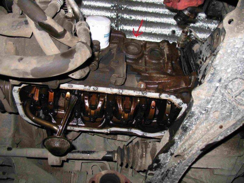 Двигатель 4a-fe. Давным-давно, однажды после поездки вытек антифириз.. Руки до ремонта дошли только сейчас, осмотр выявил отстутствие большой пробки спереди двигателя, из которой всё и выливается.. На сервисе ещё не был, в книжках информации не нашёл. Подскажите, пожалуйста, что это такое и где это искать?