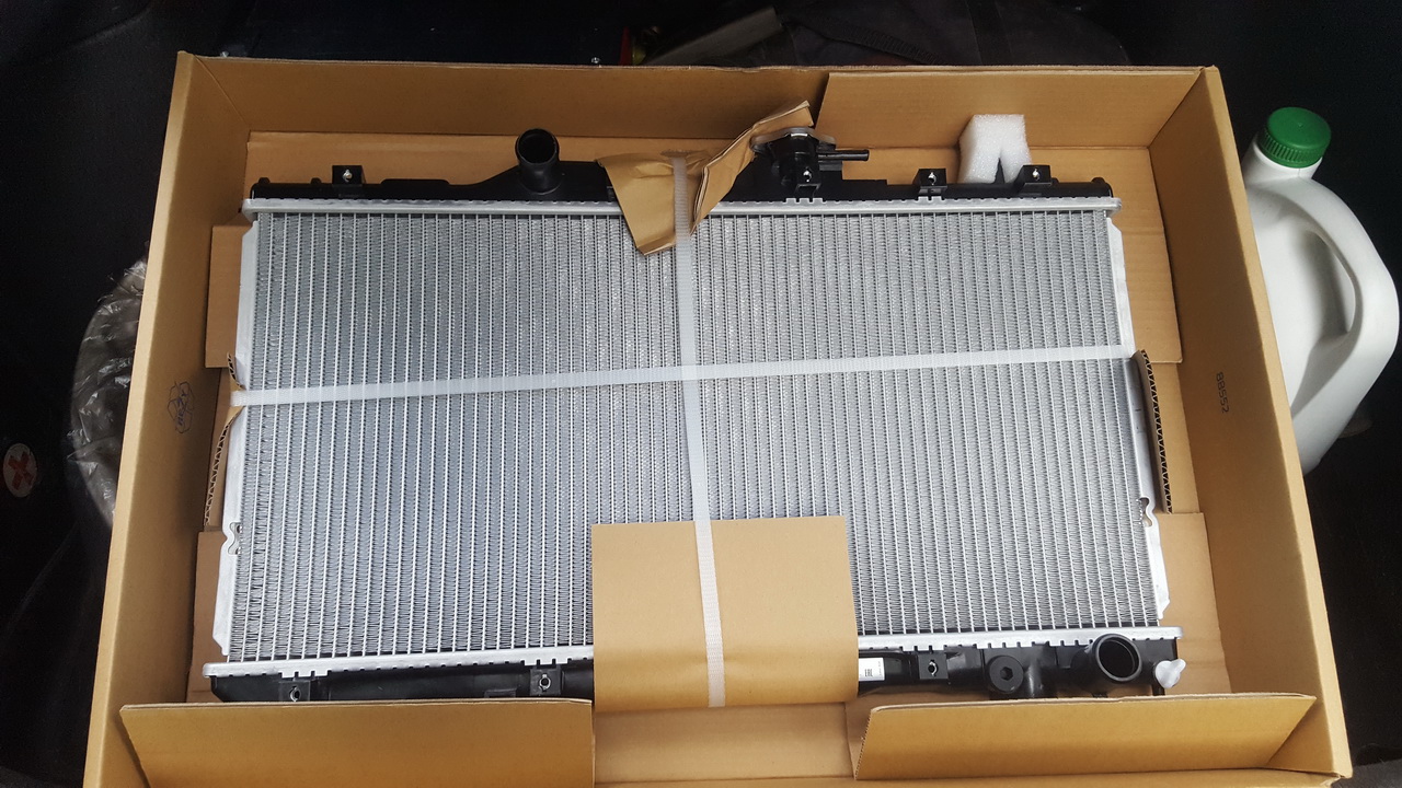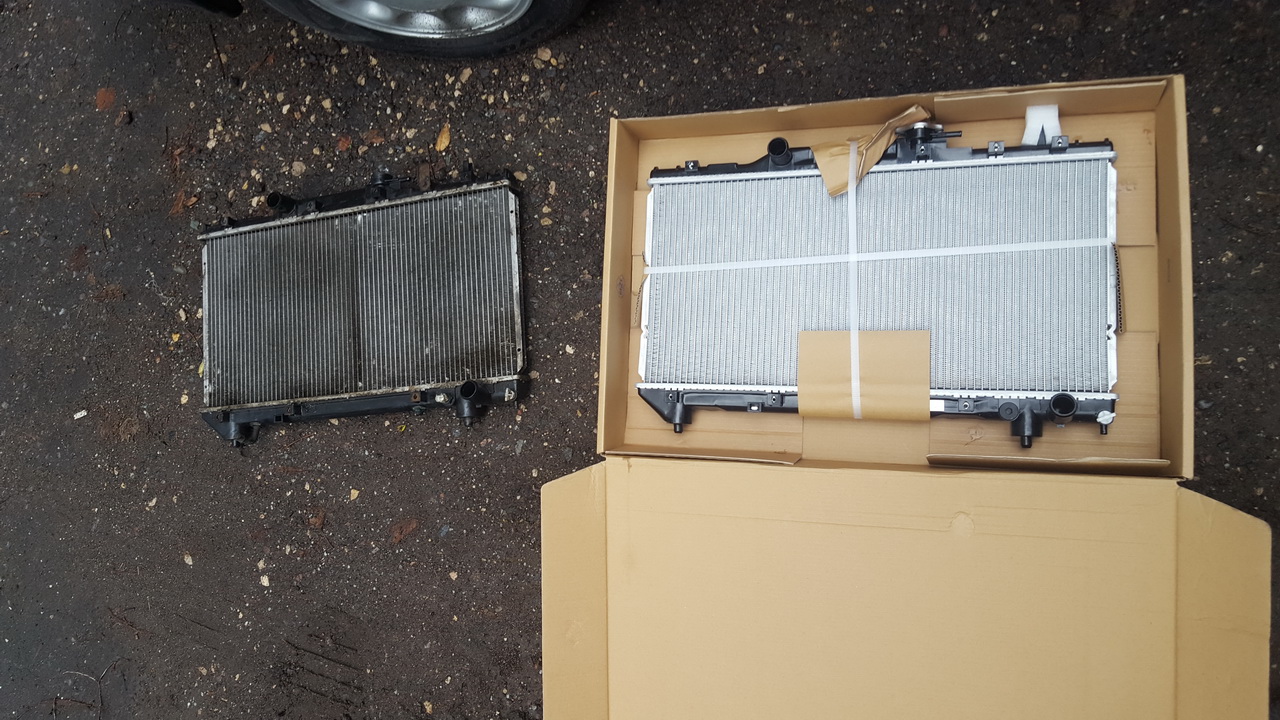 Теперь спокойно меняем! Сливаем через краник антифриз, снимаем вентилятор охлаждения ДВС, снимаем блок предохранителей, отсоединяем верхний патрубок, отсоединяем нижний патрубок, датчики, снимаем крепление радиатора и благополучно его вынимаем. Вентилятор охлаждения кондея снимаем потом на месте. Потом перепаковываем новый радиатор. Накручиваем температурный датчик и все в обратной последовательности. Ничего сложного. По ходу дела старый радиатор был для АКПП…