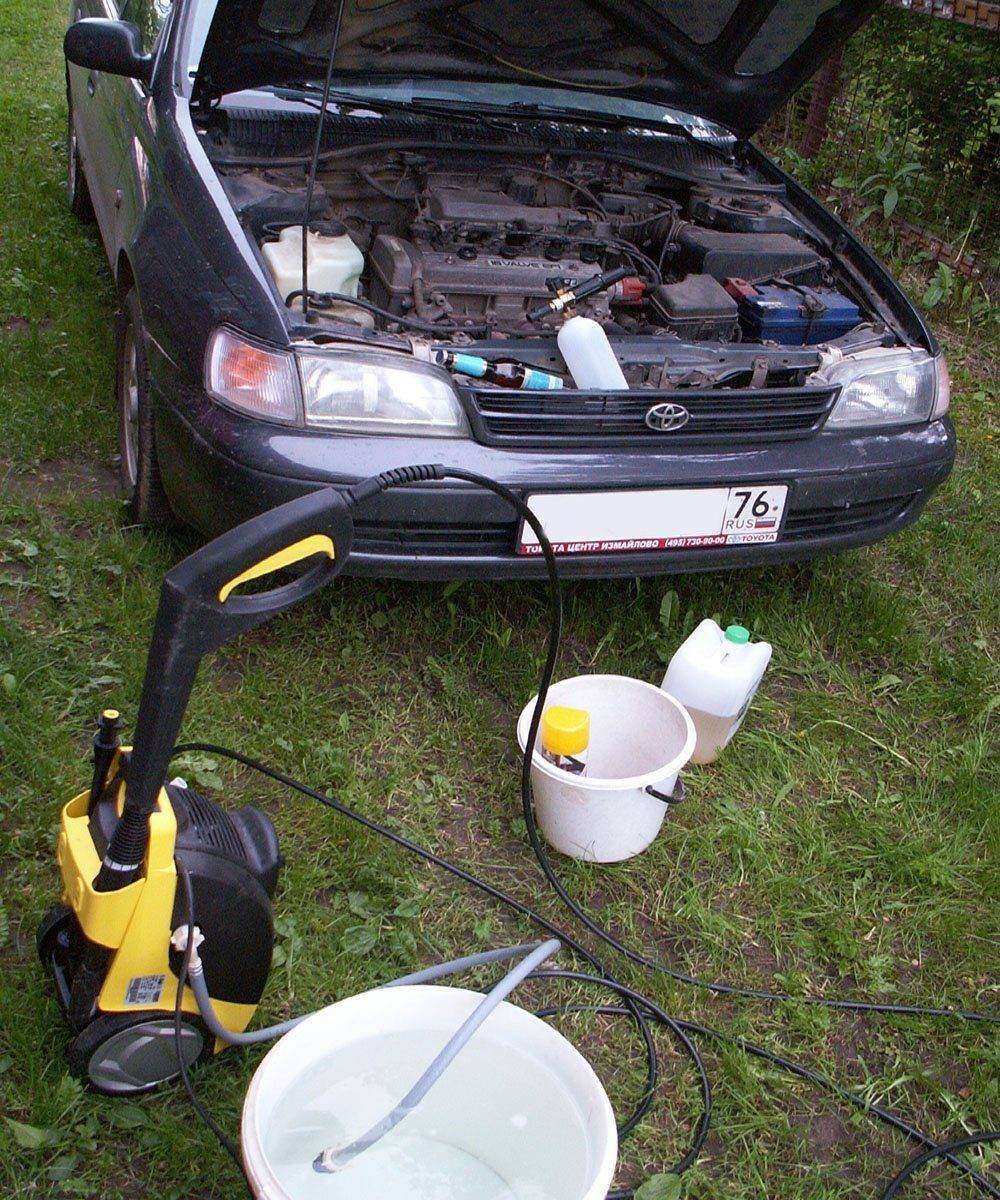 Я сам двигатель мыл. Замотал трамблер, яшик предохронители-реле, катушку зажигания. Купил в магазине баллончик с с составом для мытья двигателя. Побризгал на него. Покурил 15 минут и смыл тепленькой водицей. Размотал все, сел, завел и поехал.