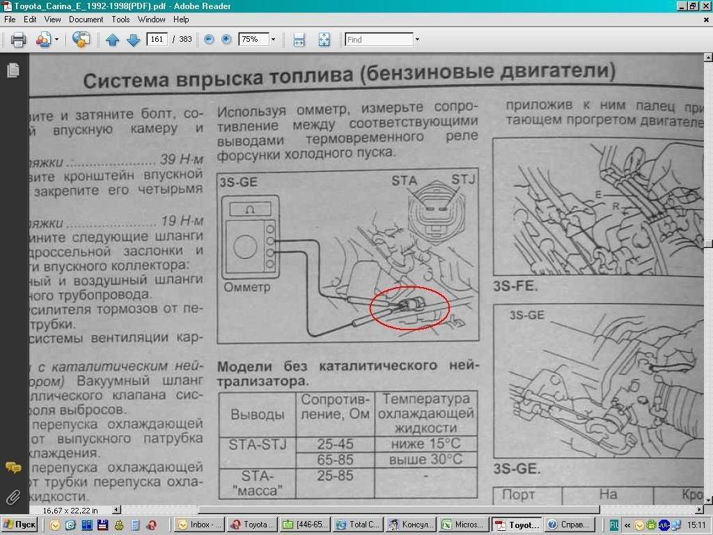 Вообщем пошукал я букварь и походу дела ошибся датчиком  . Это было термовременное реле  форсунки  холодного пуска. Вот с него то я фишку и сдергивал. У кого какие идеи ? Только букварь пишет что это для 3С-ЖЕ ??? А почему экзист в этом месте, где стоит это реле показывает ДОЖ для меня загадка, навероне трабл экзиста. Букварь тоже странный, я понял что у меня ДОЖ находиться на дне радиатора, но там надпись про 3С-ФЕ. Найду проверю, со снятием фишки.