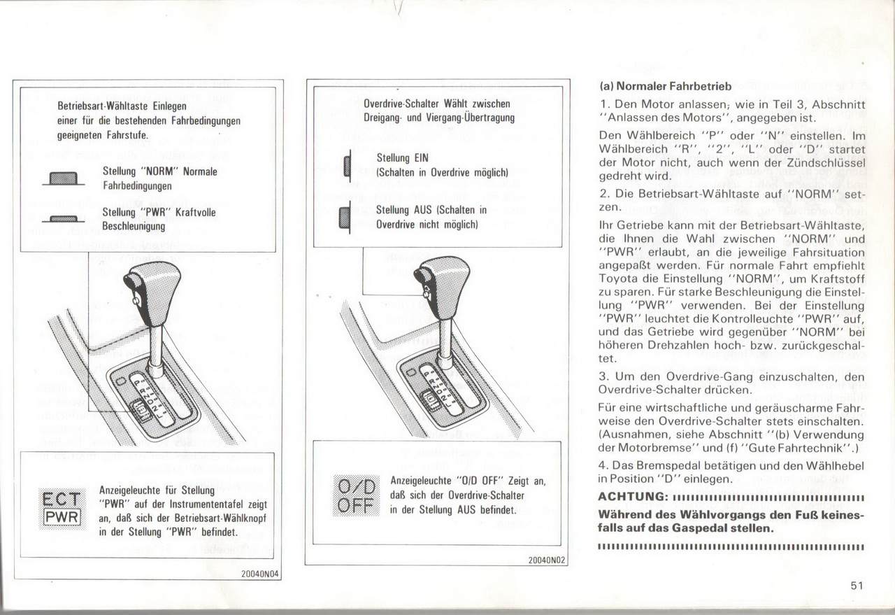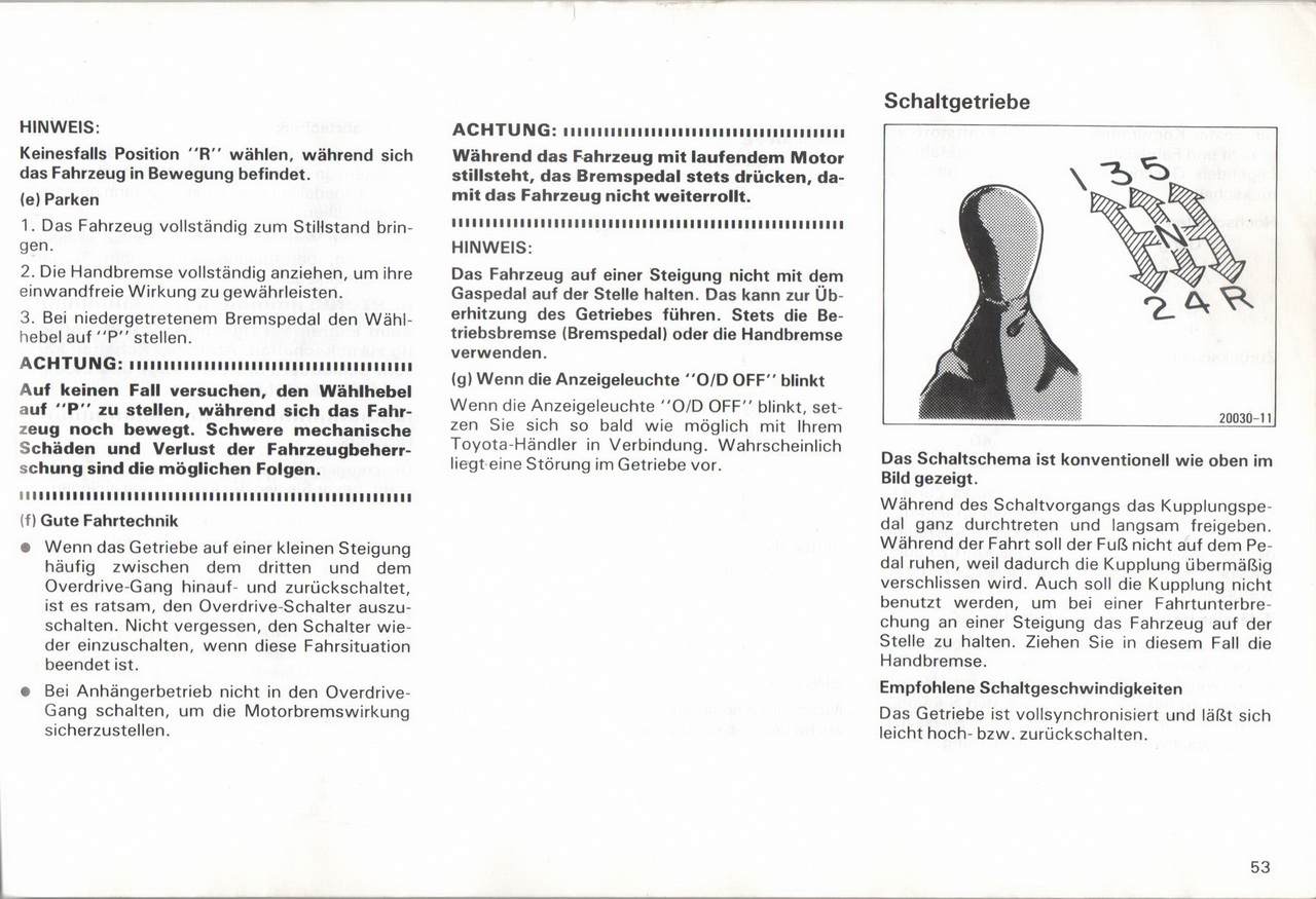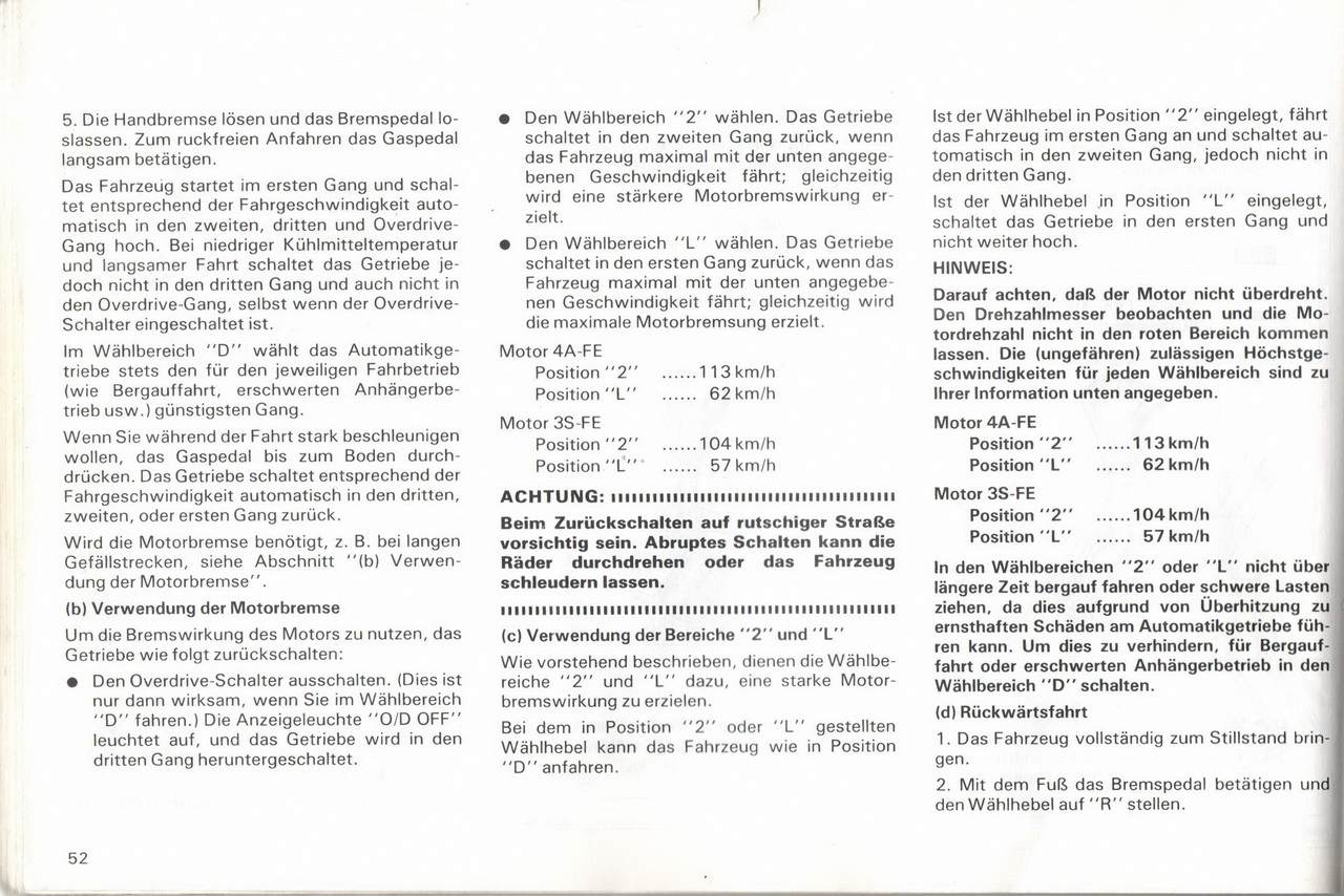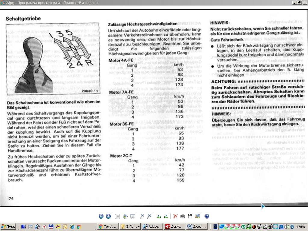 Slava21Вот скан с родной книжки, и немного корявый перевод с немецкого. Принципиальная схема является обычной, как показано выше в фильме. вызывает следующее допустимое Максимальные скорости для одной передачи:Двигатель 4A-FE Gong км / ч 1 - 53 2 - 88 3 - 128 4 - 173 Мотор 7A-FE Gang км / ч 1 - 53 2 - 88 3 - 136 4 - 173 Мотор 3S FE Gang км / ч 1 - 55 2 - 93 3 - 138 4 - 177 Двигатель 2С-Т Gang км / ч 1 - 42 2 -77 3 - 120 4 -159 В процессе переключения полностью проникните в педаль сцепления и медленно отпустите ее. Во время поездки нога не должна опираться на педаль, так как это вызывает более быстрый износ сцепления. Кроме того, сцепление не должно использоваться для удержания транспортного средства на месте во время перерыва на склоне транспортного средства. В этом случае потяните ручник. Повышение скорости слишком рано или слишком поздно приведет к подергиванию, а иногда и к моторному звонку. Регулярное удлинение передач до максимальной скорости приводит к чрезмерному износу двигателя и увеличению расхода топлива. H В БЕЛОМ: Не переключайтесь назад, когда вы едете быстрее, чем на следующей пониженной передаче. Хорошая техника вождения • Сложно включить задний ход, поставить в нейтральное положение, ненадолго отпустить педаль сцепления, а затем повторить попытку. • Чтобы избежать воздействия торможения двигателем, не включайте 5-ю передачу, когда прицеп включен. Добавлено спустя 19 минут 41 секунду:Slava21 писал(а): Если есть желание, то я сделаю копии этих страниц. Разбирайтесь в басурманском сами Давайте, будем изучать  . Добавлено спустя 1 минуту 39 секунд:Slava21 писал(а): зачем на АКПП такая таблица? Возможно  ,что я перепутал с таблицей моментов переключений для АКПП. Добавлено спустя 1 минуту 11 секунд:Slava21 писал(а): У нас одинаковые двигатели Коробки могут быть разные, как и передаточные числа  .