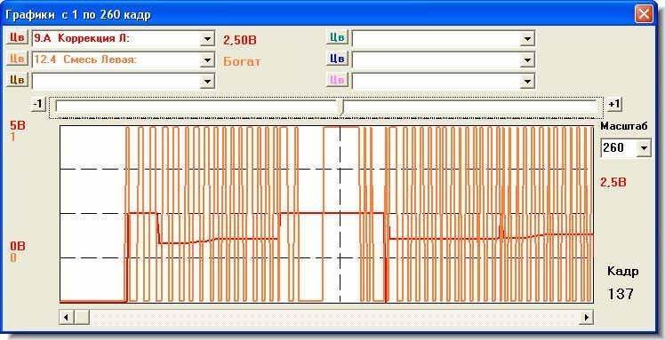 Привлекает к себе внимание некоторое залипание переключений состава смеси на оборотах, но с таким медленным протоколом смотреть на это не обязательно. Покупай Мультитроникс и увидишь фактическую частоту переключений по колебаниям времени впрыска