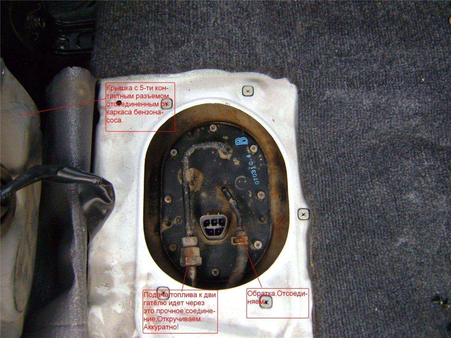 Сначала заменяем свечи зажигания,так как после процедуры они будут очень черными) Чтоб не искать двигатель от бензонасоса,решил использовать свой.Поднимаем заднее сиденье ФОТО 1, и извлекаем бензонасос вместе с корпусом.С корпуса насос снимается легко-два хомута, снимаем фильтр с самого насоса(можно,кстати и его заменить,раз уж попали туда).Сам моторчик соединен клеммой.Находим на клемме "+" и "-" Я все это запитывал от аккумулятора.