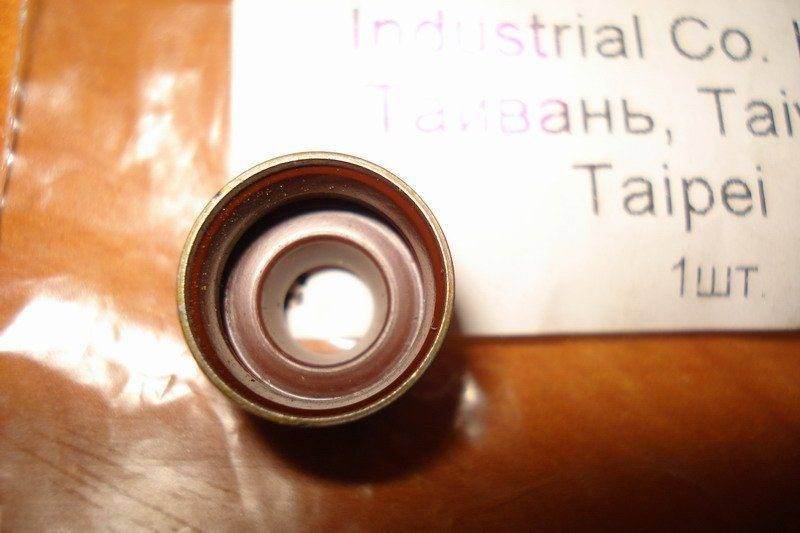 Впускные - светло-коричневые, выпускные - светло-серые. Теперь они снаружи одинаково черные. Внутри ещё можно рассмотреть отличия в цвете. Рядом родной колпачок, снятый при первой замене. Несмотря на то, что отверстие под стержень клапана у них больше (разношены), с ними расход был в пределах 1,5 - 2 л. на 10тык. С НОКами 660 под конец он уже был больше 1л на 1 тык. Там же порванные при установке выпускные колпачки. Неееежненькие! Пробовал свернуть голову старому родному (что внизу на первом фото) - хрен оторвёшь!