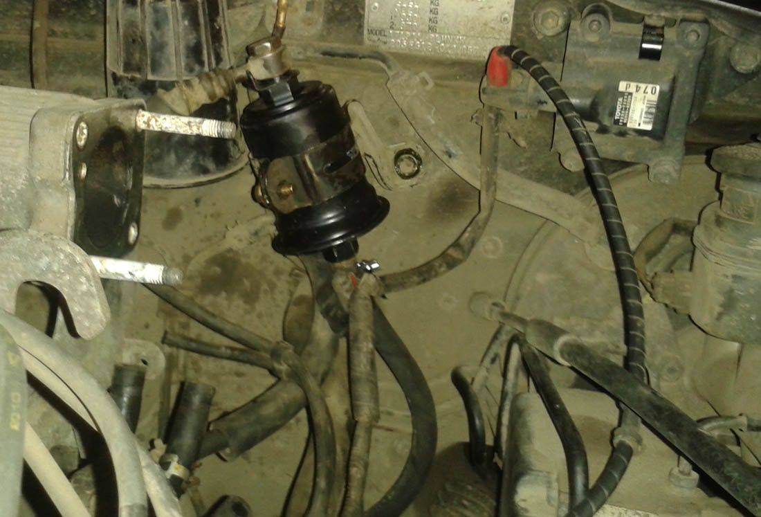 60000 км не решался поменять фильтр, вчера полез. Еле-еле открутил верх, низ не поддался, решил резать магистраль, отрезал с запасом (от штуцера отвод сантиметров 5). Уже в тисках открутить штуцер удалось, но с большим трудом. Обнаружил на кузове 2 непонятных болта (фото 1) и решил кронштейн фильтра пересадить на них, вручную разогнул плечики кронштейна - встал как родной. Фильтр с магистралью соединил шлангом (совковый, МБС, ф8 мм) длиной 45 см,по 2 хомута на каждый конец. Верхний шланг встал без особого натяга и без излома.