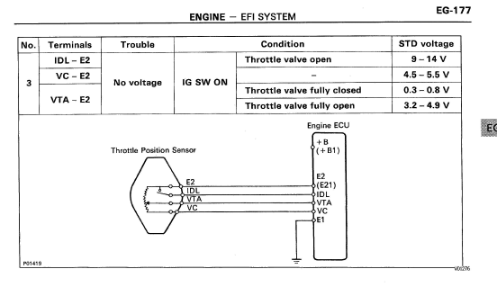 2. Попытка померять напряжение на контакте VTA принесла непонятный результат 0.5 вольта на холодную и столько же на горячую. Пробовал подключать минус мультиметра и на аккумулятор и к контакту Е2. При открытии заслонки напряжение возрастает где-то до 5-6 вольт. Точно померять не получилось,стрелка скакала