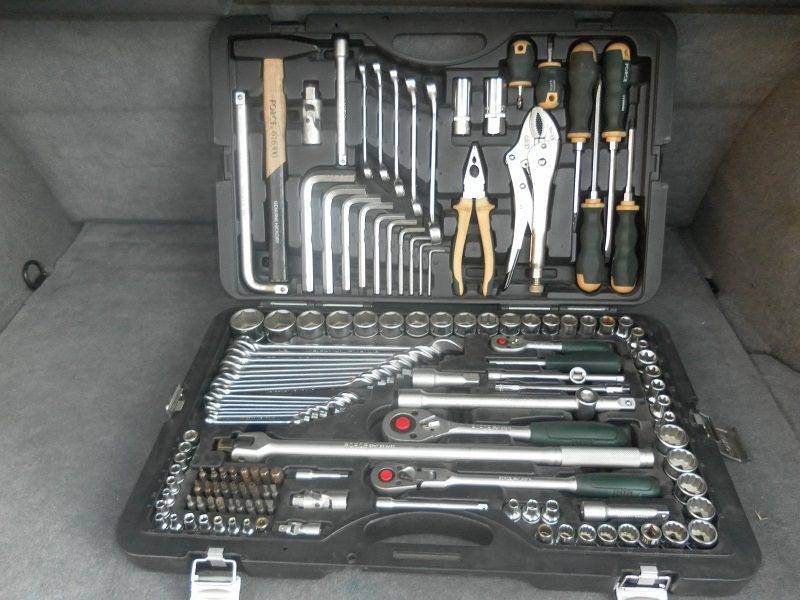 Раз пошел разговор про инструмент, то я взял Force. Тоже безумно долго искал, чтоб и с молотком и с ключами рожковыми. Причем очень часто видел, как рожковые ключи располагают плашмя и набором из 7-8 ключей "съедается пространство" в крышке чемодана! Как же это раздражало! Вт или головки длинные или ключи рожковые иначе никак, как сговорились. Но когда увидел свой набор, понял, что это то, что мне надо!!!!! См. Рисунок:) Покупался тоже в честь Д.Р. и моей девушкой:)(похоже у всех так) Правда цена кусачая и явно завышена была. Но мне денег на Д.Р. поднадарили и я не поскупился, и еще ни разу не пожалел! Еще для себя проверял такой параметр, как способность не рассыпаться при тряске! Делается это так: вытаскивается поролоновая прокладка(ибо она рвется и теряется очень быстро), и набор переворачивается и трясется во всех направлениях. И после этого проверяется, на сколько сильно рассыпался набор! Согласитесь, что не очень приятно каждый раз собирать набор, как кейс открываешь.