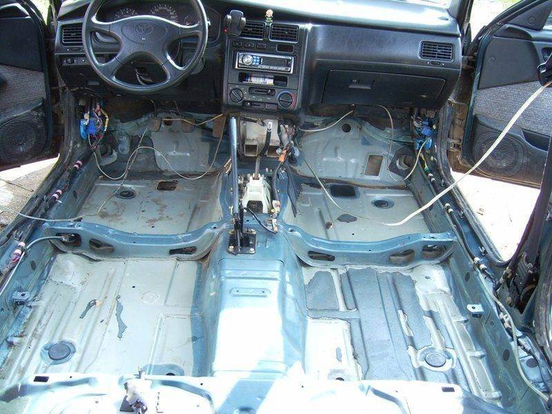 2. Дальше были вынуты сидения, снят ковер. Сразу стало ясно откуда столько шуму, половину заглушек не было на месте, все было мокро, ковер был вымочен насквозь, точнее как бы такая дополнительная подкладка из войлока под ногами передних пассажиров, со стороны салона ковер был сухой. Пришлось отодрать и выбросить все эти накладки.