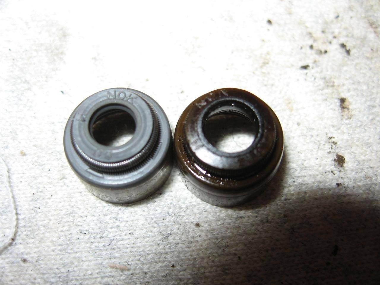 Рассмотрел сейчас снятые колпачки. На впускных стояли СЕРЫЕ. А на выпуске из КОРИЧНЕВАТОЙ резины (полимера). После длительного соприкосновения этих выпускных с маслом - переходит аж в цвет более темный, ближе к черному и расслаивается.