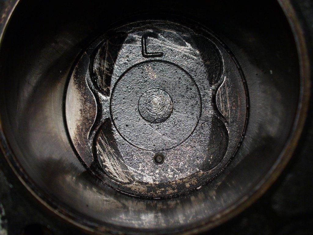 Опаньки. Всё же "инородное тело" в камере сгорания отметилось. Плохо видно днище поршня на фото, хотелось бы его вынутым увидеть. Не поломано ли там кольцо (и перегородка)? Хотя вроде цел... Да и следов на нём не очень-то заметно. Хотя головка побита давно, в смысле, - ещё при жизни мотора. Даже может быть - не в этот раз, а ещё " в прошлой жизни", причём поршень был заменен. Надо будет внимтельно поглядеть на детали.