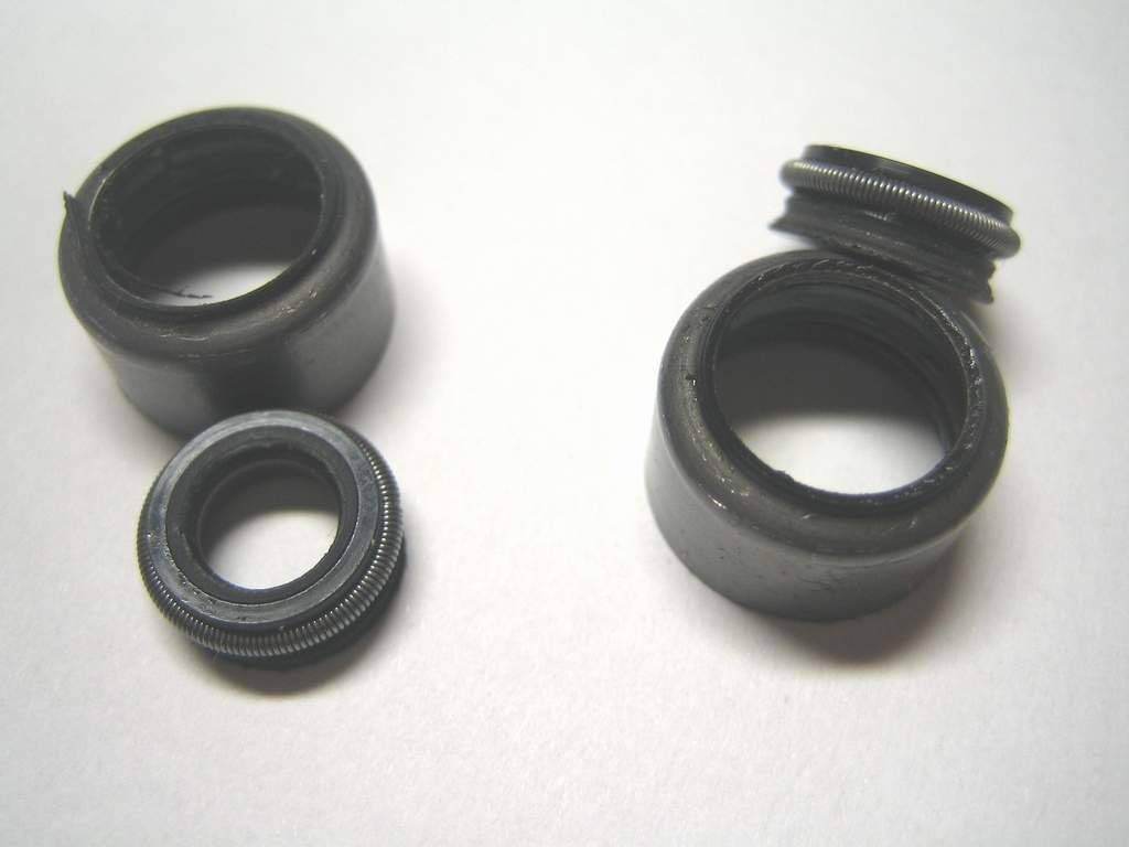 Впускные - светло-коричневые, выпускные - светло-серые. Теперь они снаружи одинаково черные. Внутри ещё можно рассмотреть отличия в цвете. Рядом родной колпачок, снятый при первой замене. Несмотря на то, что отверстие под стержень клапана у них больше (разношены), с ними расход был в пределах 1,5 - 2 л. на 10тык. С НОКами 660 под конец он уже был больше 1л на 1 тык. Там же порванные при установке выпускные колпачки. Неееежненькие! Пробовал свернуть голову старому родному (что внизу на первом фото) - хрен оторвёшь!