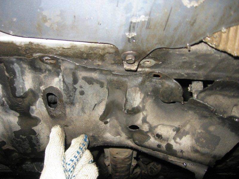 8. Откручиваем сливную гайку с блока цилиндров. Для этого я использовал накидной 12 гранный ключ на 14. Но лучше было бы обзавестить накидным ключем у которого в ушко встроена трещетка. Болт расположен за приемной трубой, над передней опорой двигателя.