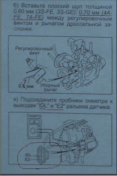 1- сдергиваем фишку с ДПДЗ и перед нами 4 контакта ( см рисунок 1) нам нужен IDL и E2, у меня они как на рисунке снизу, но у некоторых наоборот сверху. подсоединяем к этим контактам щупы мультиметра и ставим на 20кОМ. Потом берем щуп, если у тебя 4а-фе зазор на щупе 0,7. Вставляем щуп между регулеровочным винтом и пяточкой ДЗ. На мультике должна быть бесконечность ( написано 1), при зазоре 0,6- проводимость ( значение не равно единице, например 0,23 и.т.д.) и при зазоре 0,9 бесконечность (написано 1). Если у тебя все так ДПДЗ регулировать не нужно. Проверь еще ДПДЗ по значениям в таблице на рисунке №3. Если не сходятся берешь крестовую отвертку и ослабляешь 2а винта верхний и нижний, и начинаешь регулировать так чтобы при зазоре 0,7 сопротивление на IDL и E2 стало равно весконечности, закручиваешь винты, проверяешь остальные значения, нулишь мозг EFI предохранитель 20А из блока вытащить на 1 минуту. ГОТОВО.