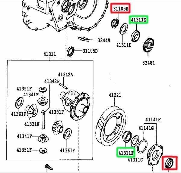 Если взять вал в руку и покачать рядом с внутренней гранатой, то есть люфт. Плюс к этому корпус дифференциала снаружи запотевший от масла конкретно. Предполагаю, что просятся на замену подшипники (зеленые) и сальники (красные)? Собственно говоря "эти" проявления у меня уже давно, но недавно залез под машину, увидел это безобразие и стал немного переживать.