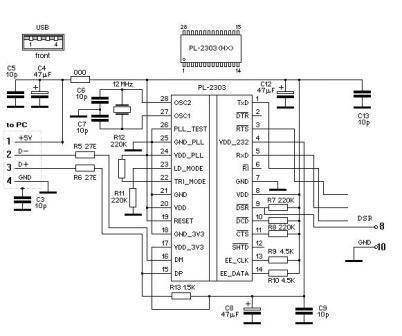 Итак, прошшупал прибором сегодня эту весьма распространенную схему на PL2303. Подключение DSR очень похоже на приведенном рисунке. При подключении в USB на 9 ногу через резистор 220 кОм приходит напруга (~4,06В), формируя 1 на входе (как я понял). От 9-й же ноги идет выход на 8 вывод платы. Значит, что при отсутствии напряжения на 8 выводе (то есть 1 с Vf1) на 9 ноге так и будет 1, что при подаче сигнала всё равно будет 1.