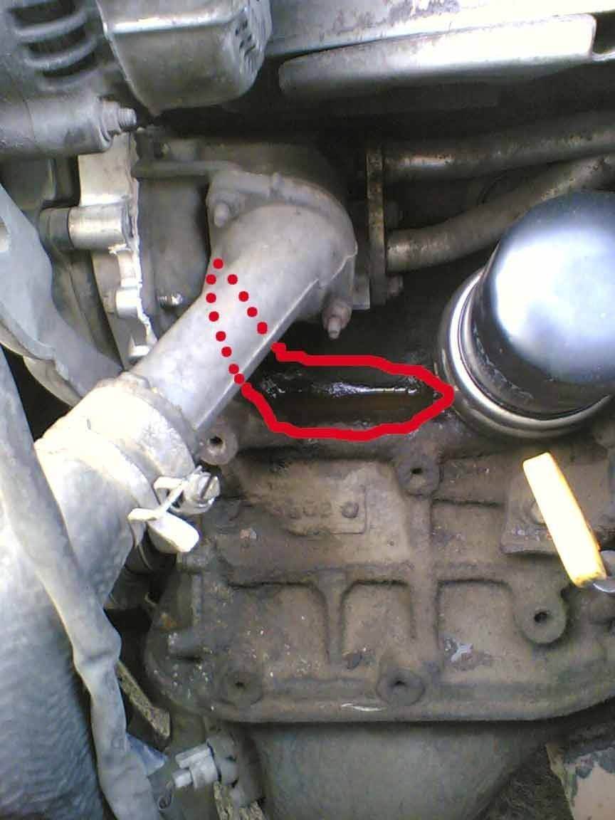 Стык С-образного подводящего трубопровода и ГБЦ. Трубопровод снимали, поди, когда помпу тулили, а прокладки новой не было...