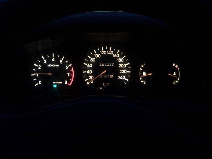 После долгих мучений с пайкой светодиодов нашел в магазине светодиодные лампы с мет. цоколем по 30 руб. (фото выложу позднее), отпаяв цоколь, с помощью термоусадки сделал "бесцокольный цоколь" а в верхней части тахометра и спидометра дополнительно сделал подсветку из обычных сверхярких светиков для обеспечения равномерности. После этого купил светодиодную ленту, долго и мучительно спаивал цепочку из нее, но в конечном итоге разочаровался, т.к. для внедрения этой цепочки пришлось бы городить колхоз в приборке, стрелки не подсвечиваются (они светятся только если направить свет в световод, там где вставляются лампочки) ну и третье это то, что заменить сгоревший светик проще, чем переделывать весь огород из светодиодной ленты, а равномерность свечения не намного лучше.