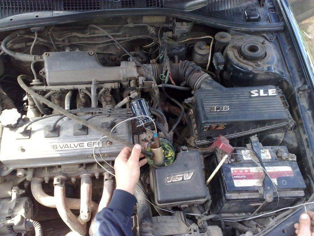 Я у себя промыл тут форсунки в субботу , сначала полез смотреть бензонасос , думал забитая сетка , глянул там всё нормально , ну решил мыть форсунки , рампу снимать дело геморное на 1.6 не лб . Плюнул на это дело и сделал так : от топливного фильтра отвернул сверху шланг , взял старый топливный фильтр который я не выкинул после замены , привернул к нему шланг от рампы а с другого конца фильтра приделал шланг , ввернул в резьбу шланг резиновый и конец шланга надел на сосок бензонасоса(брал для этого дела прям родной насос который я вынул для прочистки) , на кинул два провода на клеммы ему , снял обратку и надел шланг на сосок её , потом взял от бутылки полторашки отрезал половину . Налил туда чуть чуть бензина , обратку и насос погрузил туда , клеммы накинул , отец пошел и завел машину , работала она на такой системе , потом взял баллончик Карбоклинера , перевернул его вниз пипкой , нажал и спустил газ , потом ножом срезал горловину , и жидкость из него вылил в банку где был бензин , откуда качал бензонасос