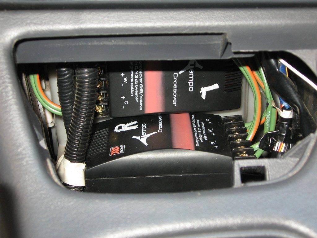 На перед - компоненты Morel Tempo 6. Мидбасы внатяг, но встали в штатное место. Твиттеры (пищалки) - вместо боковых дефростеров на торпедо. На треугольники дверей у зеркал не вставали из-за довольно больших размеров подиума. Кроссоверам место нашлось сразу за пепельницей/прикуривателем, посадил их на 2-сторонний скотч. Провод от мафона до кроссовера получился короткий. Провод от кроссовера до мидбасов в дверях использовался штатный, провод от кроссовера до твиттеров пробросил новый.