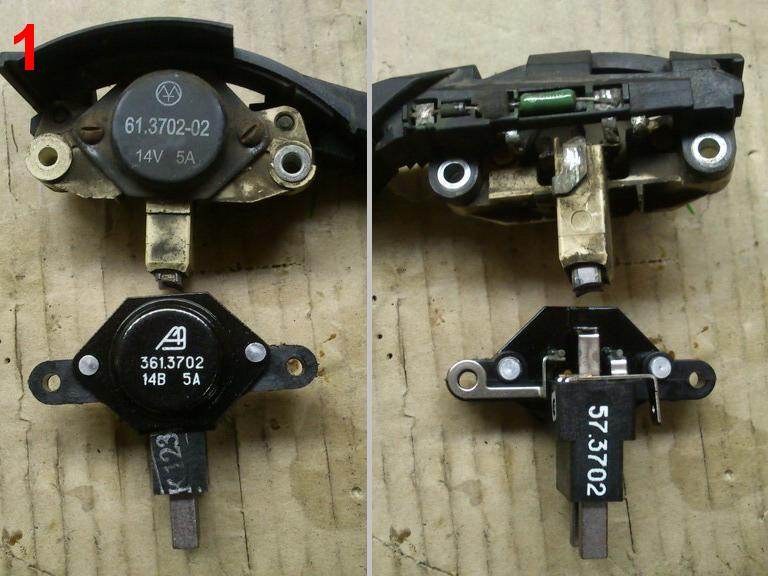 Возможно, для Москвичей и Питерцев, избалованных относительной доступностью и выбором запчастей, мой опус будет неинтересен. Но кому-то может и пригодится. Речь пойдёт о "Бошевском" генераторе, но для остальных разница лишь в форме и размерах деталей, а принцип работы везде одинаков. Так что данный опыт может быть применён и в других случаях. Сгорел у меня на днях генератор. Точнее не сгорел, а перестал "генерить"  Время 23-30, хорошо ещё, что рядом с домом. Поездку по ночным делам пришлось отложить. Наутро сдёрнул генератор с машины. Частичная разборка и "прозвонка" потрохов тестером показала, что щётки ещё в норме, обмотки ротора и статора целы. Вывод - регулятор напряжения, на что также намекал и тестер. В близлежащих магазинах детали "в наличии" не нашлось, только под заказ. Exist "порадовал" ценами и сроками: 1800 - 6700 руб. и доставка до 6 - 8 дней. Вариант "1 день(не гарантированно) за 6700" жаба отмела сразу, вариант 8 дней за 1800 казался более привлекательным, но ехать надо было "уже вчера". В итоге, освежив в памяти устройство и принцип работы генератора в целом, купил регулятор нового образца от ВАЗ-2108, и занялся делом. Говоря словами Михал Иваныча (по-совместительству Белого Гуся), "перекрёстное опыление дало потрясающий результат": генератор ожил, выдав законное напряжение потребителям. Затраты: регулятор от "ТАЗа" - 88 руб(разницу в ценах и доступности детали сравнивайте сами), и пара часов чесания репы, ползанья по схемам, и возни с кусачками и паяльником. За два дня, прошедших с момента "выписки больного", на одометр намотано около 250 км, полёт нормальный. Делал как временный вариант, но сейчас сижу и думаю: а надо ли теперь заказывать оригинал, даже если за 1800? Для таких же сомневающихся и спешащих ездить, небольшой фотоотчётец: (кликните на фото для увеличения)  ЗЫ Благодаря усилиям коллег выяснилось, что можно не возиться с перепаиванием таблетки, а переставить щёточный узел с таблеткой в сборе от новых генераторов ВАЗ-2110. Подробности далее по ветке, вот здесь: http://carina-e.ru/viewtopic.php?p=35013#35013Дополнение 2015.Прошло 6,5 лет с момента описанного ремонта. Отечественный донор сдох по пути на работу в праздничный майский день. До работы дотянул, пришлось доехать "на коллеге" до ближайшего магазина автозапчастей. По проторенной дорожке ремонт был повторен и дополнен заменой порядком изношенных щёток. Подробности на фото: 1. Имплант и донор фас и профиль; 2. Некоторые вроде бы ставят так, но при таком варианте неудобно крепить регулятор (на первом фото видно, что у родного двойные "уши" для крепления к корпусу разъёма). К тому же надо как-то добавить ещё один контакт, соединяющийся в генераторе с диодным мостом, и отсутствующий у донора (показан стрелкой на фото 6); 3. Слева родной корпус щёточного узла освобождённый от старых щёток и с прочищенными отверстиями для новых, в центре новые щётки и пружинки от донора, справа родные изношенные щётки (в прошлый раз не менялись, того остатка, что был в первом репортаже, хватило на 6,5 лет и 121000 км. пробега); 4. Подготовленный к сборке комплект. Пружинки донора намного жёстче, посему решено было оставить родные. Думаю, контактные кольца ротора скажут за это спасибо. Кембрики тоже переставлены; 5. Почти собранный узел. Осталось пропаять ближнюю щётку; 6. Готово. Стрелкой указан тот самый контакт, о котором упоминалось в п. 2; 7. Схема соединени