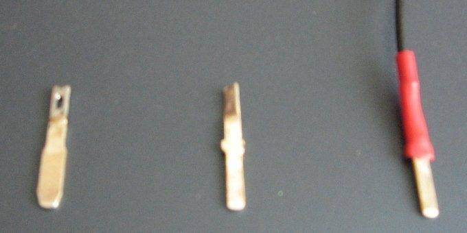 Вкратце - находим советский разъем типа РП14-30 или похожий, добываем из него требуемое кол-во контактов, стачиваем примерно на 1 мм ширину контакта напильником, припаиваем провод и одеваем кембрик. Контакт готов. Потом все соединение обматывается сверху изолентой. (Контакты кстати имеют серебряное покрытие).