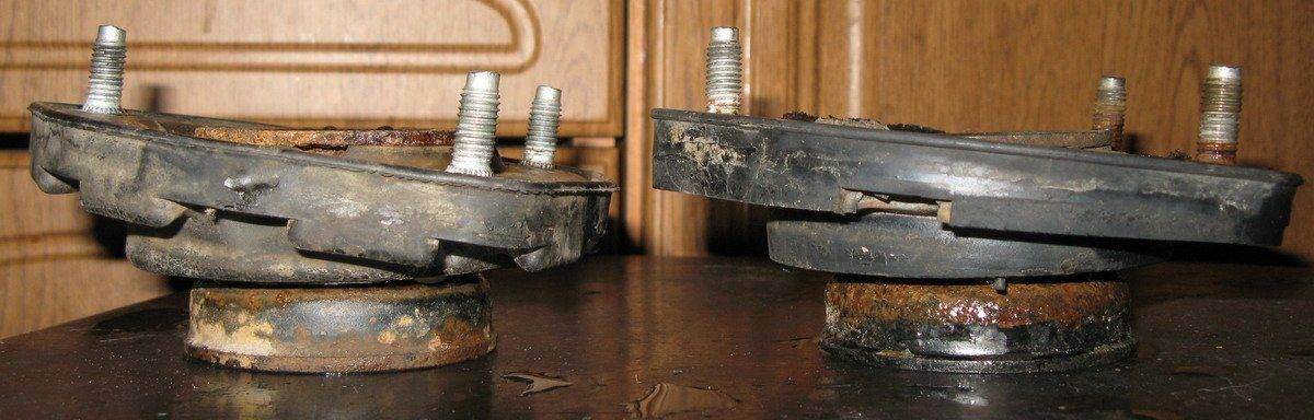 Ты в начале втулки под гайки поставь. Глядишь и стук пройдет. И не придеться заморачиваться с др. опорами. Может на старых стойках резьба была длинне, вот и не потребовались втулки. Вот у меня и у кореша KYB стойки. Так на них не хватает резьбы. Без этих втулок плотно не затягивается.