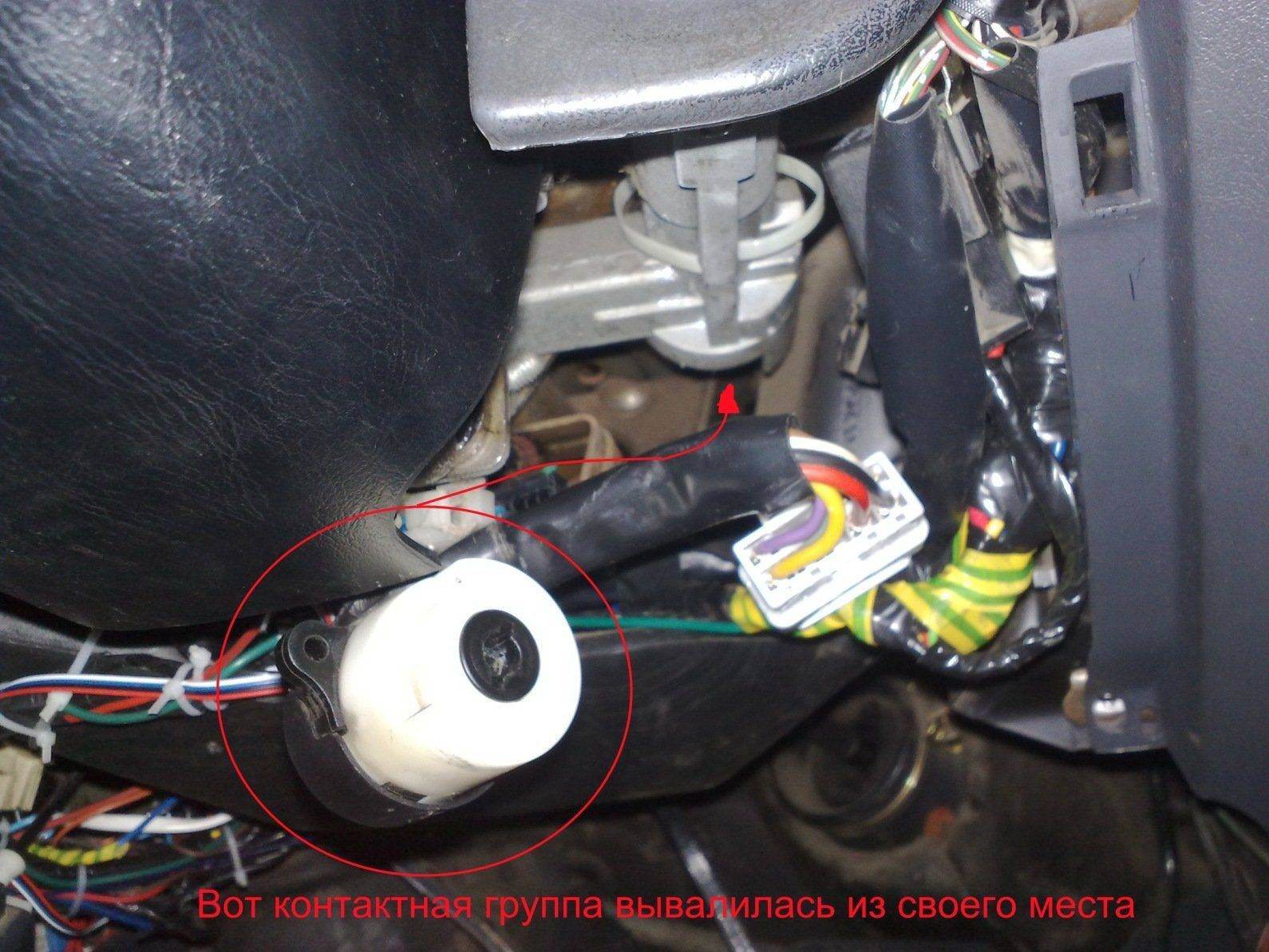 Ездили сегодня с другом электриком потрошить проводку что бы завести проводами , начали когда шевелить там фишку чтобы разъединить её , то случайно увидел что вдали на проводах висит какаято хрень , вообщем оказалось что контактная группа просто вывалилась из своего места , там два болта должны быть , но их почему то не было , может от вибрации отвернулись уже давно и я их не заметил на коврике , вот фото выложил с этой группой , я её немного вытащил что бы удобно было заводить , в ней как раз паз есть отверткой очень удобно заводить , но завести так и не смогли . АКБ за это время что она стояла на стоянке уже сдох и не крутил движок , прикуривание тоже ничего не дало , реле просто щелкало и стартер не крутило , с толкача пробовали но тоже без результатно , колеса даже на третьей скользили по снегу , и руль очень туго крутился , вся машина замерзла бедняжка . Вообщем снял АКБ и привез его домой заряжать , ща стоит заряжается, завтра пойду пробовать завестись .