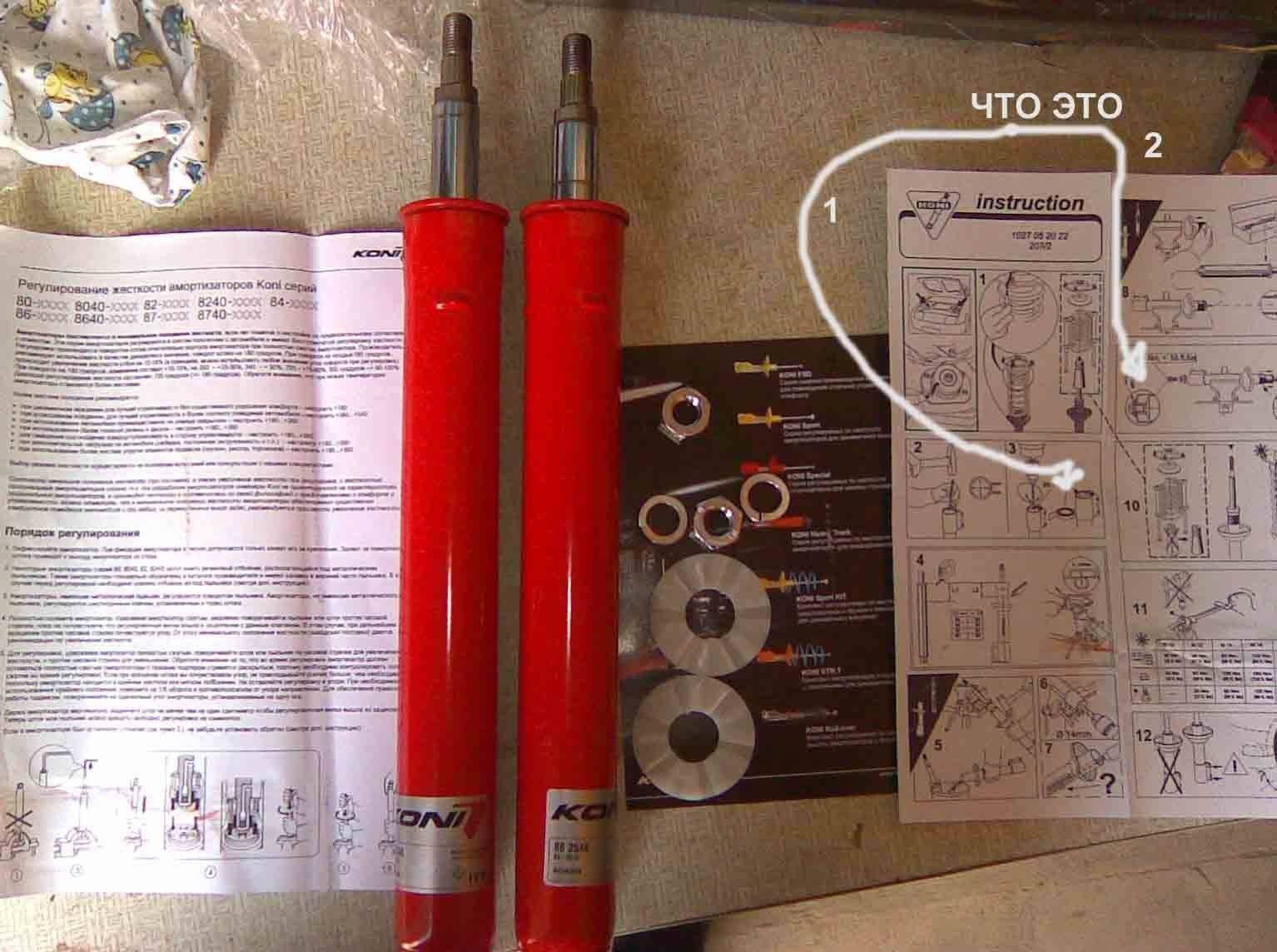 Всем привет! Потекли все стойки (на всех маркировка TOYOTA) я ездил 3 года и до меня не знаю скока. Решил начать с передних. Взял катриджи Koni 86-2548, вышло за 7782 деревянных, брал как и все у http://www.koni-rus.ru/. Приехали за 4 дня. Счастливый прибежал в гараж, вскрываю коробку и как-то не радостно, что-то в них не так. Первое, что смутило, то что на катриджах о том, что они Koni говорят тока плюшевые наклейки, то есть ничё на корпусе не выбито, ну хотя бы нацарапано. Второе- из метизы присутсвуют только пластмассовая шайба, 2 гайки с контр шайбами на шток и ВСЁ, а как же болт с какой-то шайбой (на картинке пункт2)? Ну и как-то свободно шток ходит, то есть прокачка труда не составит. Пошарпанность коробки тоже оставила осадок. Подскажите кто ставил сие чудо – ОНО ли (ЧУДО) ко мне приехало?, может зря я переживаю- на Питерских нелегалов зубы точу.