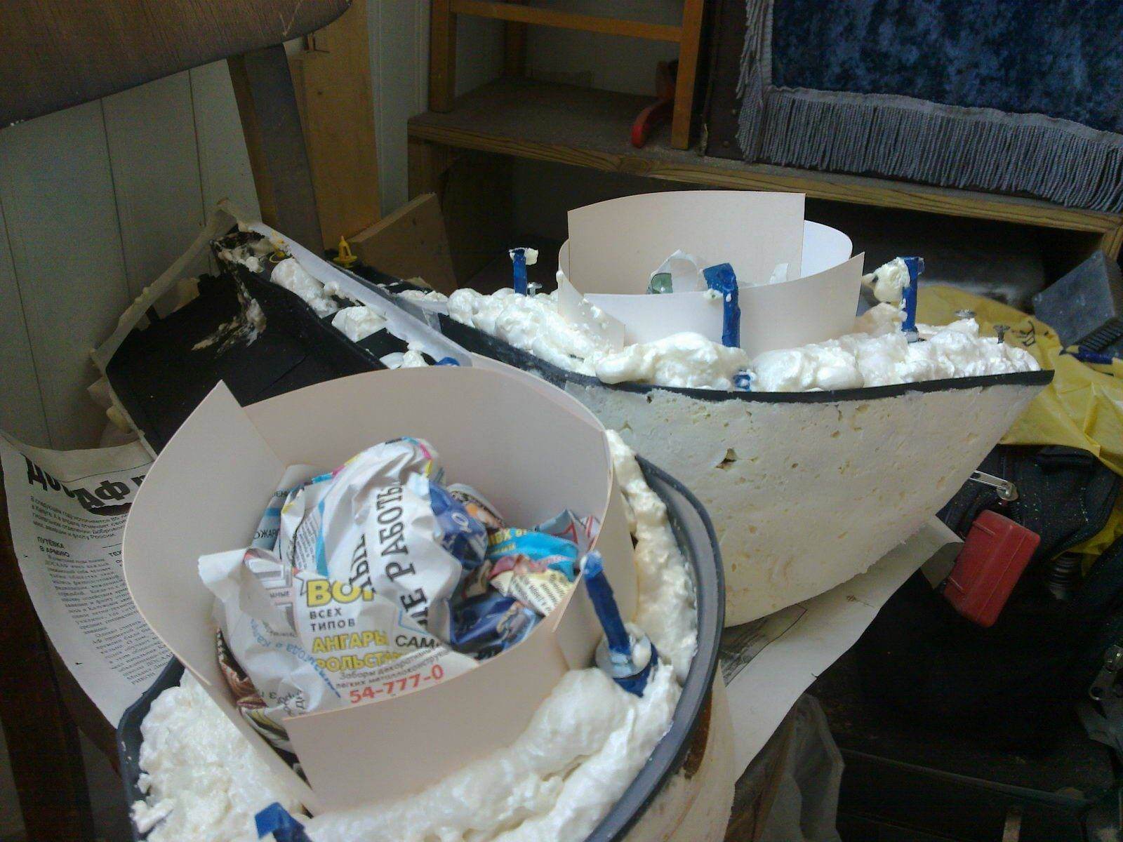 6)Заливаем всё это монтажной пеной! Можно попытаться сделать методом мокрой пены(выдавоивая перед нанесением воздух в воде) но я не стал заморачиваться. Не забудте одеть грязную одежду - от пены чистым уйти тяжеловато :D