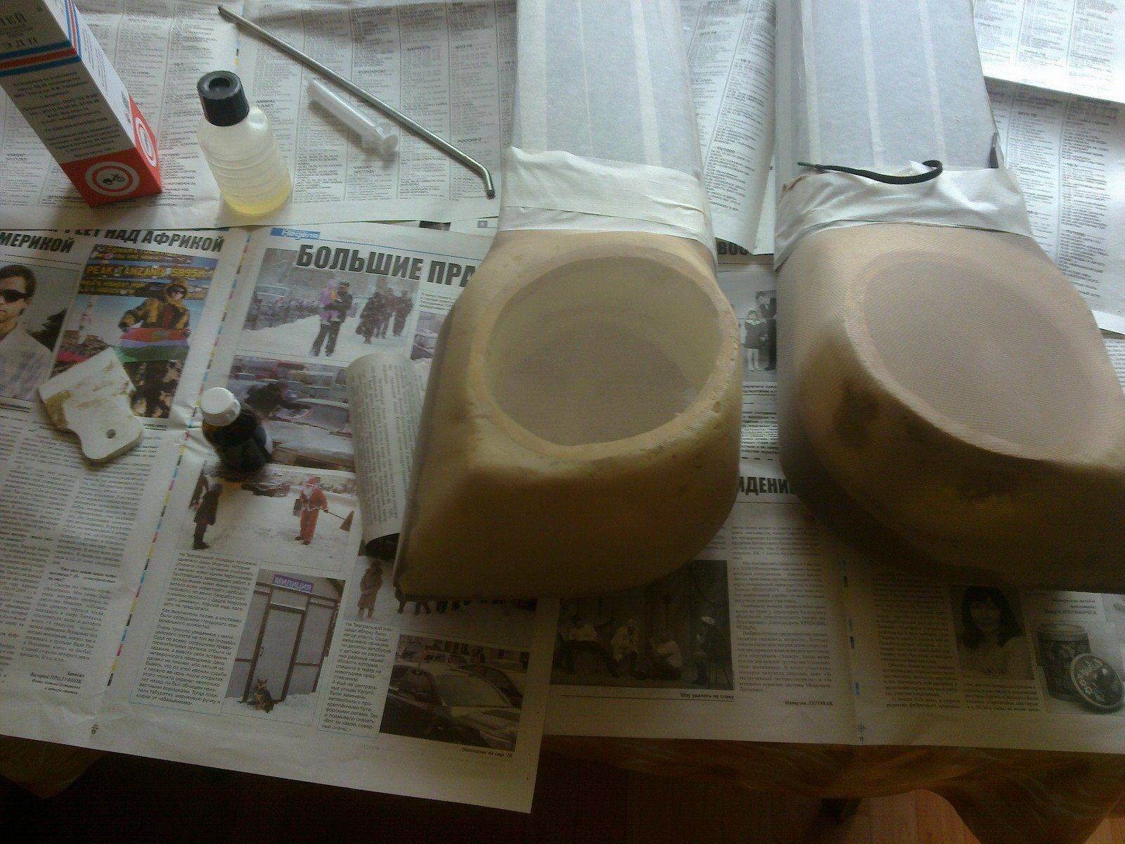 8 ) Похищаем(более интересно :) ) или выманиваем(банально :D ) плотные колготки у любимой и обтягиваем ими нашу заготовку. Поливаем эпоксидкой и втираем её в паверхность(я пользовался шпателем) Спешить и разводить всю эпоксидку - НЕ НАДО! Делайте постепенно и не торопясь. Иначе не успеете и она станет колом, а вы пойдёте в магази за новой порцией. После подсыхания, прорезаем отверстия и наносим эпоксидку внутрь и вообще всюду, куда можно дотянуться, для крепости конструкции и предотвращения контакта пены с окружающей средой. Ждём полного высыхания эпоксидки.