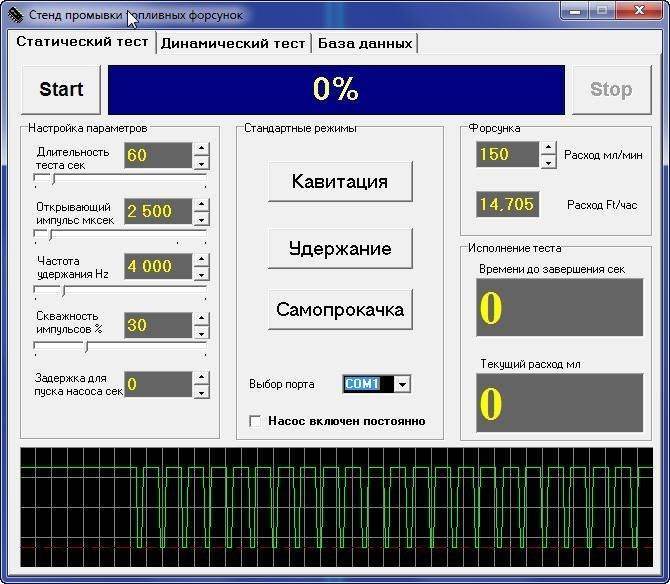 Переменным резистором меняем скважность импульсов. на звук 0% до 100% (осцилографа нет, но форсунка щёлкает с разными звуками)...