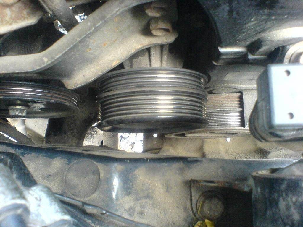 Я шкив набрасываю на фланец, но не прикручиваю. Завожу на место помпу, креплю её к двигателю. Шкив при этом свободно висит на фланце, не падая (ибо нет ему достаточно свободного места, чтобы упасть между фланцем и лонжероном). Потом уж ставлю среднюю часть кожуха ГРМ, только тогда сажаю на место и прикручиваю шкив.