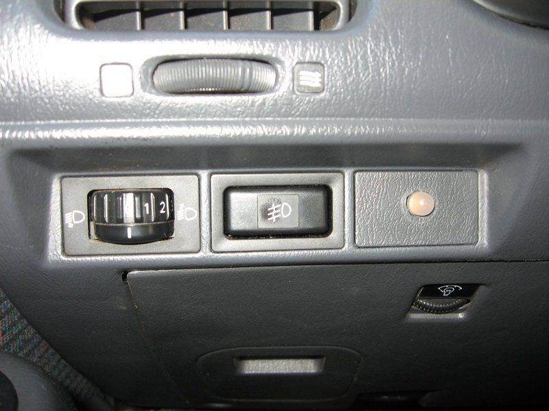 Поставил оригинальную кнопку включения передних ПТФ. Все хорошо, но оказалось, что в родной кнопке нет индикации включения, а только подсветка. В кнопке от 15-ки, которую использовал до этого, индикация включения присутствовала. Так как мириться с утратой этой функции не захотел, решил сделать отдельный индикатор включения передних ПТФ. Результат на фото. В качестве индикатора светодиод оранжевого цвета свечения диаметром 8 мм, установленный в соседнюю заглушку. Даже портить заглушку мне не пришлось, это сделал за меня прежний владелец, заботливо просверлив в ней отверстие почти точно нужного диаметра  . Пробовал также синий светодиод, не понравилось, как-то раздражающе светит