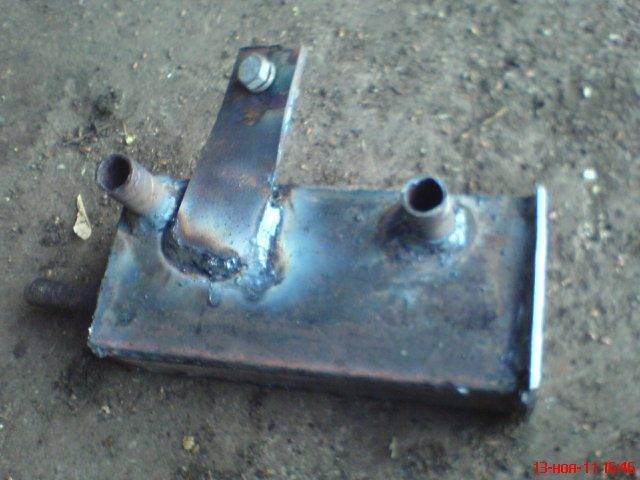В общем затеял я как то в начале зимы соорудить подогреватель охлаждающей жидкости двигателя, с возможностью быстрой замены нагревательного элемента в случае выхода его из строя. Можно конечно же было купить аналогичный электрокотёл, но веры китайцам нет. Начнём пожалуй: Шаг первый, вырезаем из железа (я брал 4мм толщиной) стенки будущего котла, с запасом по 2 см с каждой стороны, относительно тэна предполагаемого для установки. Тэн взят от стиральной машины Ariston, на 1,5 кВт. Шаг второй, если не умеем пользоваться сваркой, то находим профессионального сварщика, как в моём случае и свариваем заготовленные детали. Шаг третий, прикидываем, где будет стоять наш подогреватель и не находя более свободного места под капотом, ориентируемся на установку перед радиатором. Отмечаем примерное расположение штуцеров для шлангов, а так же места крепления котла к кузову. В итоге котёл планируется крепить в двух точках, на телевизоре отверстие снизу будет выполнять роль как направляющей, а в сквозное отверстие с боку мы прикрутим наш котёл на один болт. Шаг четвёртый, привариваем штуцера и заранее приготовленные элементы крепления. Снова всё примеряем на авто, вроде всё как положено встаёт. После того как котёл остынет от сварки вставляем и притягиваем сам нагревательный элемент. Шаг пятый, соединяем всё это дело с двигателем шлангами, можно было бы конечно же через пробку сливную подцепиться, но в виду отсутствия необходимого штуцера, было принято решение врезаться в магистраль между печкой и двигателем, а точнее подачи ОЖ от печки в двигатель. Для лучшей циркуляции ОЖ, в эту же магистраль был установлен насос от газелевской печки и надёжно спрятан под стойкой крепления АКБ. Для питания данного насоса был куплен блок питания 220В 50Гц/12В 5А. Всё это дело подключено таким образом, что при включении электрокотла от электросети, насос начинает работать автоматически от БП, а при отключении электро котла из розетки, можно было бы включить данный насос заранее установленной кнопкой из салона для питания от штатной АКБ, для лучшего прогрева салона на ХХ.