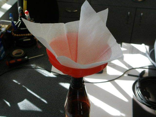 Mr_Nuke писал(а): откуда тогда эта грязь на фильтре Это излишек одного из компонентов присадки, который был в тестовой партии. (Официально Пирамин пока не продается)Кристаллики компонента в бензине растворяется, просто медленно. Не успевшие растворится кристаллы - задерживаются сеткой и фильтром. Форсункам ничего не грозит. Sairo писал(а): который надо было хорошенько разболтать еще в бутылочке, перед тем, как заливать в бак Не совсем так. Перед использованием, осадок кристалликов отфильтровать через салфетку (сейчас фотку добавлю) . На эффективности промывки это никак не скажется, т.к. кристаллики относятся к вспомогательному компоненту. Если не взбалтывать, то все кристаллики остаются на дне бутылки. В последующих партиях этот недостаток будет исправлен. PS Любые промывки топливной системы, рационально всегда производить перед плановой заменой топливного фильтра. Т.к. смытая "средняя" грязь где-то же должна осесть, её и ловит фильтр. Сеточка Карины стоит копейки (у меня всегда лежат новые на запас), а если нет желания или возможности её менять - она очень легко моется, её просто нужно высушить и вся грязь сама осыпается. Добавлено спустя 17 минут 26 секунд:Re: [П] Моторное масло ТОТЕК, присадки ТОТЕК. Скидки для клуба.1. Взять пустую бутылку (например из под УМТ) и большую воронку. 2. В воронку положить ватку (не утрамбовывать, просто положить). 3. Целую салфетку без отверстий, сложить кульком и положить воронку. 4. Не взбалтывая, постепенно перелить в воронку, 5. Самым последним вылить осадок.