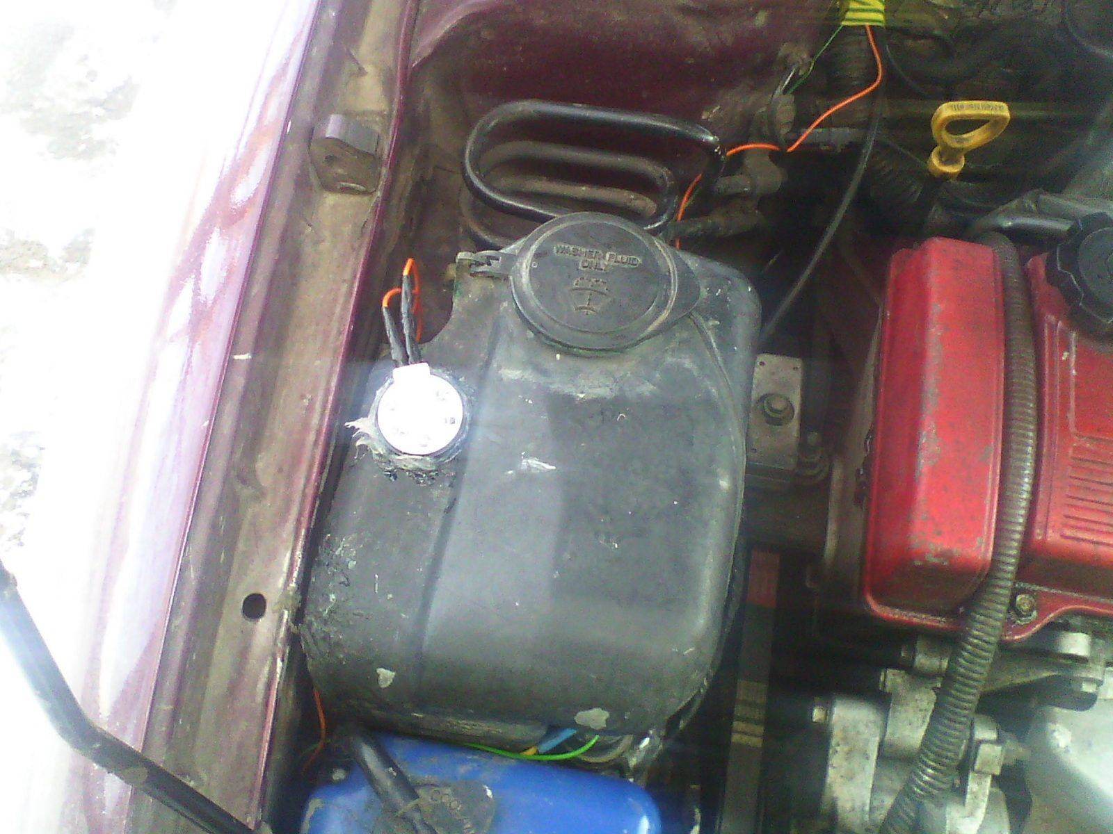 мой вариант датчика омывайки)обошлось все в 150 рублей, было куплено датчик расширительного бочка с Ваз. провод и клейма, фото буду выкладывать в течении дня! дачик монтируется с верху достает до середины бочка. знаю мало, но когда долго не пользуешься и не помнишь сколько там и чего что бы не лезть в полне! датчик работает следующем образом минус постоянный, потом другой минус от 2 клеймы тянется к лампочке (фото ниже, ) а плюс идет на лампочку постоянный. когда жидкость опускается. дачик срабатывает и лампочка загорается)) все просто…