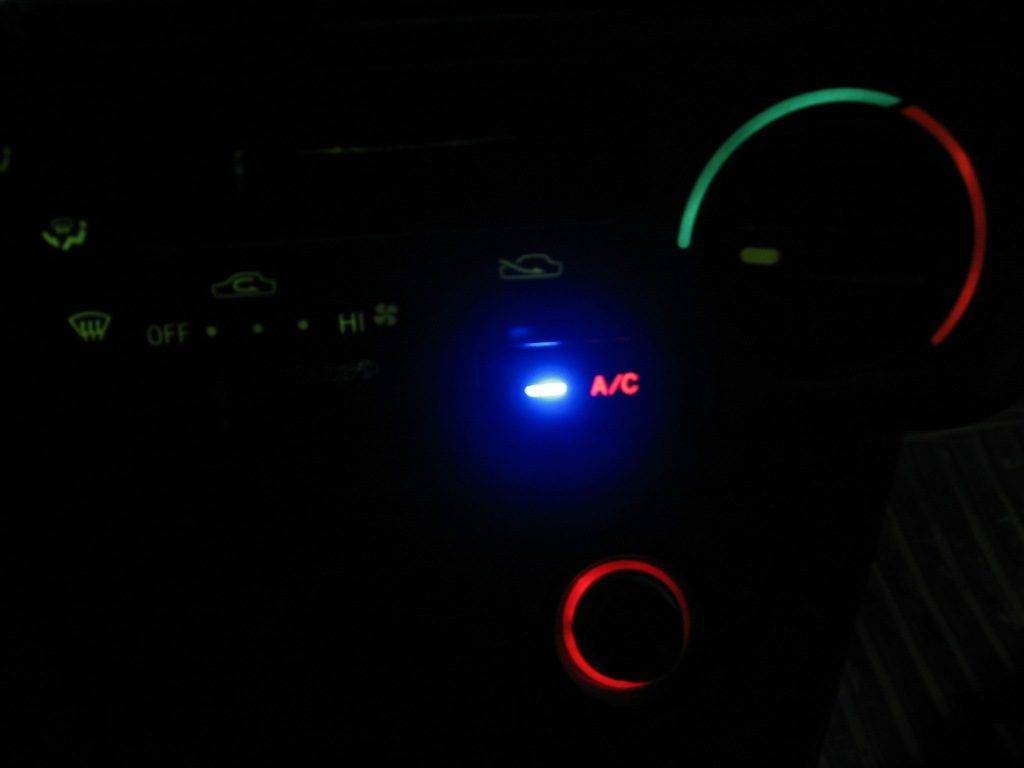 Кнопка кондиционера имеет очень слабый индикатор включения на зеленом светодиоде, в солнечный день его практически не видно. Решил впаять вместо него синий светодиод, яркость получилась - более чем достаточно  , в самый солнечный день отлично видно. Зеленый светофильтр кнопки никакого влияния на синий цвет свечения светодиода не оказывает. Попутно вместо штатной лампочки подсветки кнопки с зеленым колпачком поставил красный смд-светодиод. Вот что вышло.