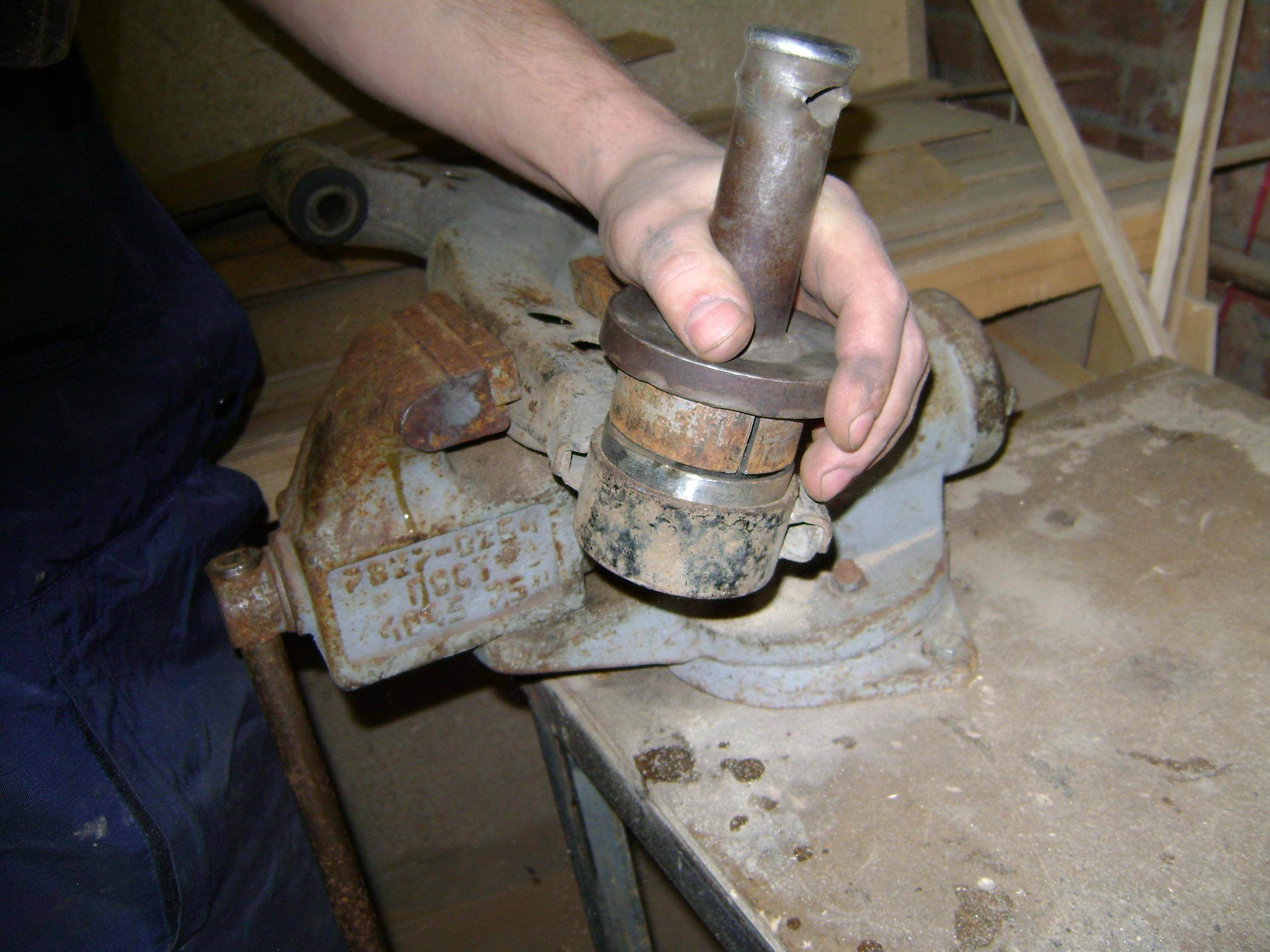 Я выпрессовывал и запрессовывал в тисках при помощи куска трубы и обоймы от старого подшипника. Только при выпрессовке приходится дополнительно по подвижной их части молотком постукивать через каждые полоборота, чтобы сорвать сайлент с насиженного места (на фото видно примятость над воротком). Иначе не идёт, можно и винт в тисках сломать  .