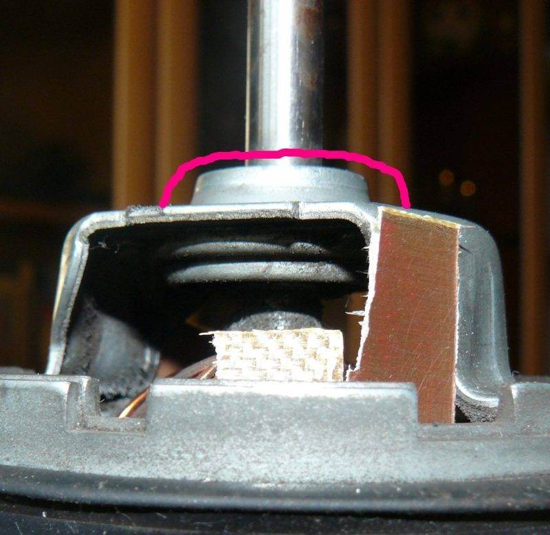 Комментарий к файлу: Моторчик печки (BOSCH). Красная стрелка показывает на место износа втулки. Синие стрелки показывают на распорки, которыми регулируется магнитный зазор и зазор во втулке.