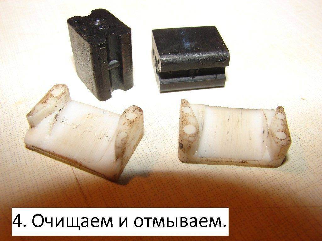 Папы у меня тоже оказались в отл. состоянии, видимо материал прочнее  , мамы (они по природе мягче) я разобрал: отогнув лепестки вытащил две резинки и два сухарика, почистил, зашкурил. Резинки оставил, а сухарики выточил из капролона по снятому образцу. На все двери 8 сухарей (одинаковых). Собрал мамки в обратном порядке. Установить на место очень просто и руки по локоть не надо засовывать. С торца в отверстие продеваем кусок мягкой проволоки, ловим ее в отверстии динамика, цепляем за ушко папы (одетого на маму до упора), направляя рукой, аккуратно вытягиваем проволоку, захватываем рукой и сажаем на место. Ушло дня два на изготовление, установка минут 5-7 на каждую, зато двери ка новые... душа ликует!!!