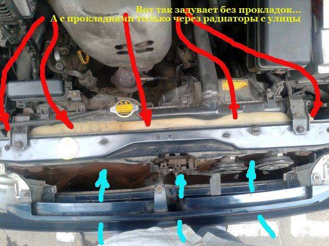 Когда работают вентиляторы - по одному или в паре, то они затягивают воздух не только с улицы, но и из подкапотного пространства, а там я думаю как в парилке - жарковато от работающего движителя... А в таком случае только с улицы, где наверное похолоднее... Только смущает одно но, параллон немного лежит на радиаторе кондиционера... хоть площадь прилегания не очень большая, но все же...