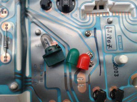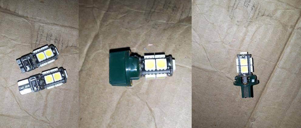 сегодня поставил в панель светодиоды (9 кристаллов SMD 5050), заказывал на ebay, по деньгам вышло около 200 руб обточил ноги до нужных размеров, установил.. пришлось правда крутить их, чтоб найти полярность нужную. свечение очень плотное, недосветов/пересветов нет, регулировка правда ступенчатая, но этого достаточно, доволен очень подсветкой. По фото: 1. вид оригинальных и подпиленных. как стоят в плафоне 2. подсветка 1 диода в левой центральной части vs 2 родные лампочки (один диод явно пересвечивает 2 штатные лампы). полная подсветка диодами на средней яркости 3. минимальная яркость vs максимальная яркость.