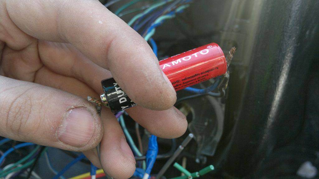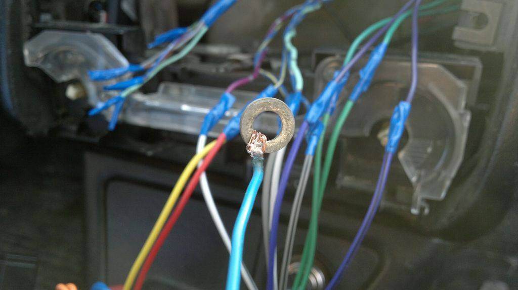 Принцип прост: при правильном подключении батарейки диффузор динамика сдвинется чуть вперед. При неправильном назад. Проверил не зря - правильно был подключен только правый передний. Добавлено спустя 3 минуты 32 секунды:Ну и далее паяльник, изолента.. Масса из косы очень уж слабая по сечению, пришлось изобретать, так как в город ехать не на чем было. Вложение: