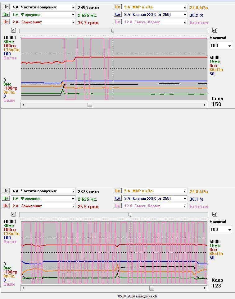 Дмб писал(а): vel Так оно и есть Дима прав, так и будет с отключенным ДОС. Когда ты отключил ДОС, у тебя на приборке должен был загореться ЧЕК, а скрепочная диагностика должна показать 21 ошибку. В этом случае ЭБУ начинает работать по другим (можно назвать АВАРИЙНЫМ) таблицам зашитым в памяти ЭБУ. Теперь еще раз вернемся к твоему последнему логу с подключенным ДОС. В момент запуска движка ЭБУ видит БОГАТУЮ смесь. Как только ты открываешь ДЗ, т.е. подаешь в цилиндры дополнительный воздух, в этот момент у тебя обороты 2425, время на форсах 3.000 мс, и зажигание 22,6 гр. в этот момент ЭБУ видит БЕДНУЮ смесь. В это момент смесь у тебя еще БОГАТО. Далее ЭБУ видя что ДЗ открывается и обороты повышаются, ЭБУ для поддержания оборотов снижает время на форсах до 2,625 мс. и увеличивает УОЗ - 23,6 гр. И тут ЭБУ видит что смесь стала БЕДНО. ЭБУ тут же увеличивает время врыска до 2,750 мс и не много уменьшает УОЗ - 23,1 гр. Далее УОЗ возвращается на 23,6 гр но так как смесь все еще БЕДНО - обороты падают до 2475. В следующем кадре - обороты возвращаются на 2500. Далее увеличивается УОЗ - 35,3 гр. Смесь еще БЕДНО. Далее обороты падают, увеличивается время впрыска и смесь переходит в БОГАТО. Затем еще несколько всплесков БЕДНО-БОГАТО, т.е. ДОС еще пытается передавать что то на ЭБУ и ВСЕ!!!! с 148 кадра смесь залипла на БОГАТО... Далее поддержание оборотов ХХ происходит только за счет регулировки УОЗ. Причем обороты ХХ находятся в нижнем пределе. Для наших ДВС обороты ХХ должны лежать 750+/-50. т.е. 700 - 800. А по твоему логу падают аж до 675. У тебя случаем вибрация не ощущается на ХХ? Думаю, что ДОС все же придется менять. Привожу еще раз сравнение твоего и своего логов.