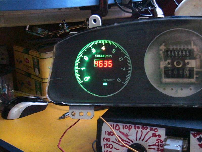 Добалю интриги, засветил 2х тахометр - симбиоз китайского цифрового и аналогового на LM3914. Аналоговый работает вместо стрелки, засвечивает шкалу в зависимости от оборотов. Вложение: