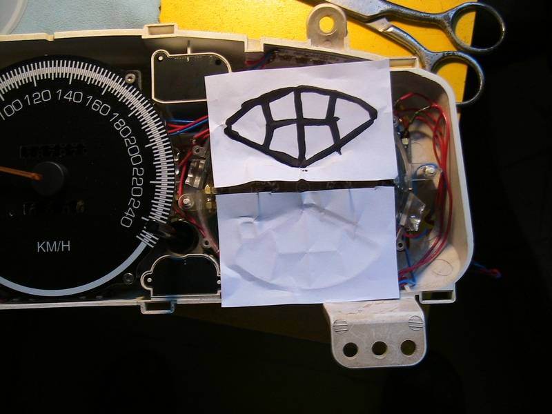 На шкале тахометра нужно нагородить вот такую штуку - использовал остатки самоклеющегося сплена, можно использовать антискрип. Вложение: