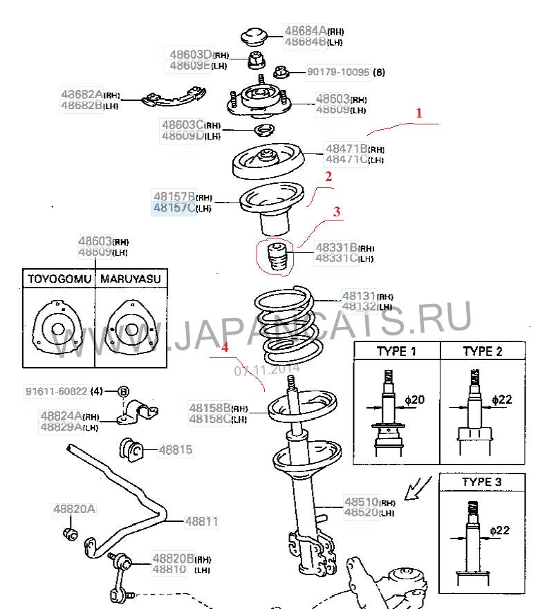 2-это пыльник,4-прокладка в чашку,отбойники проверь,можно поставить с тазика.Ну если в передней подвеске шумов не было,то опоры живы скорее всего.